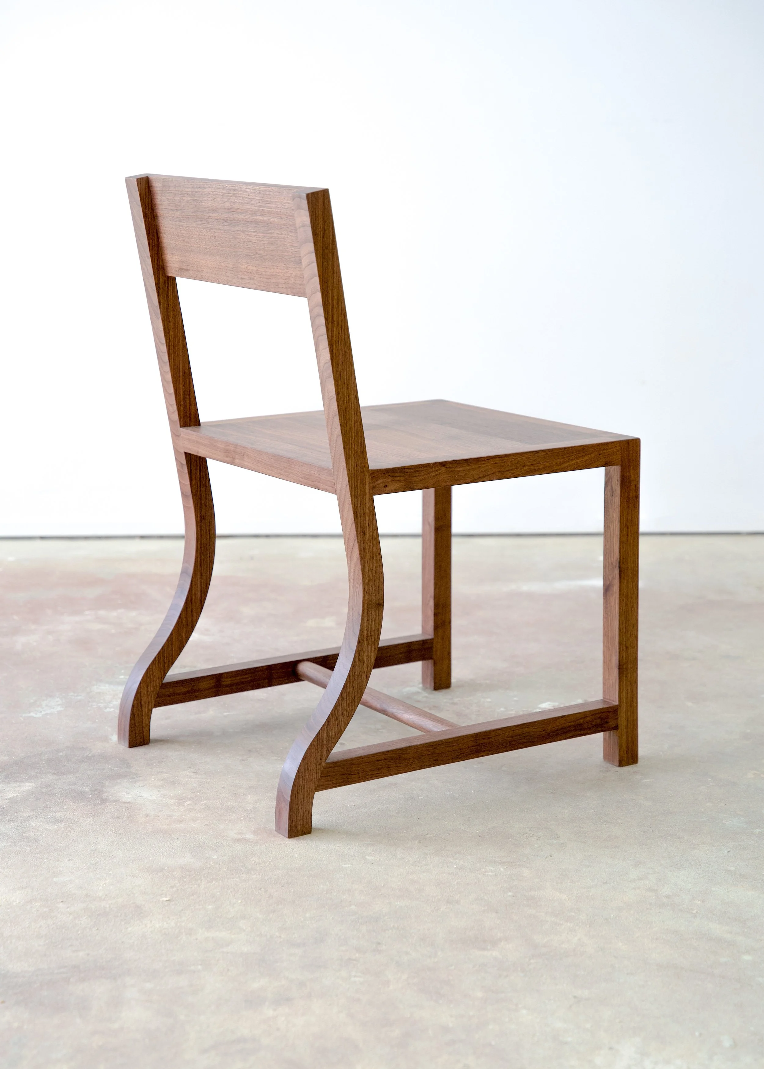 Simple dining room chair with curved back leg and clean silhouette .