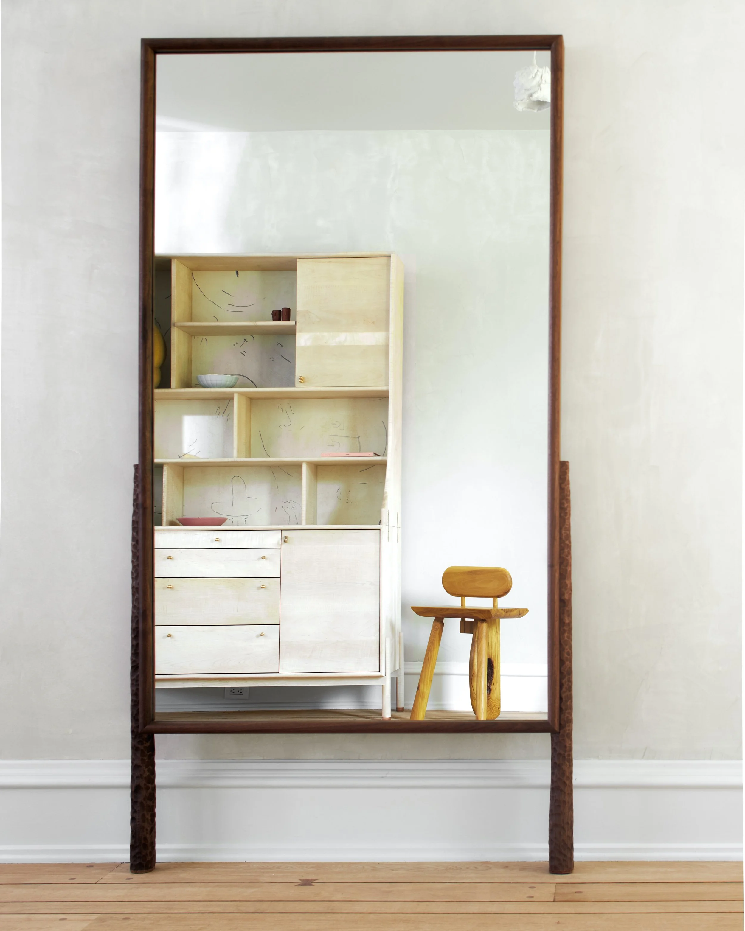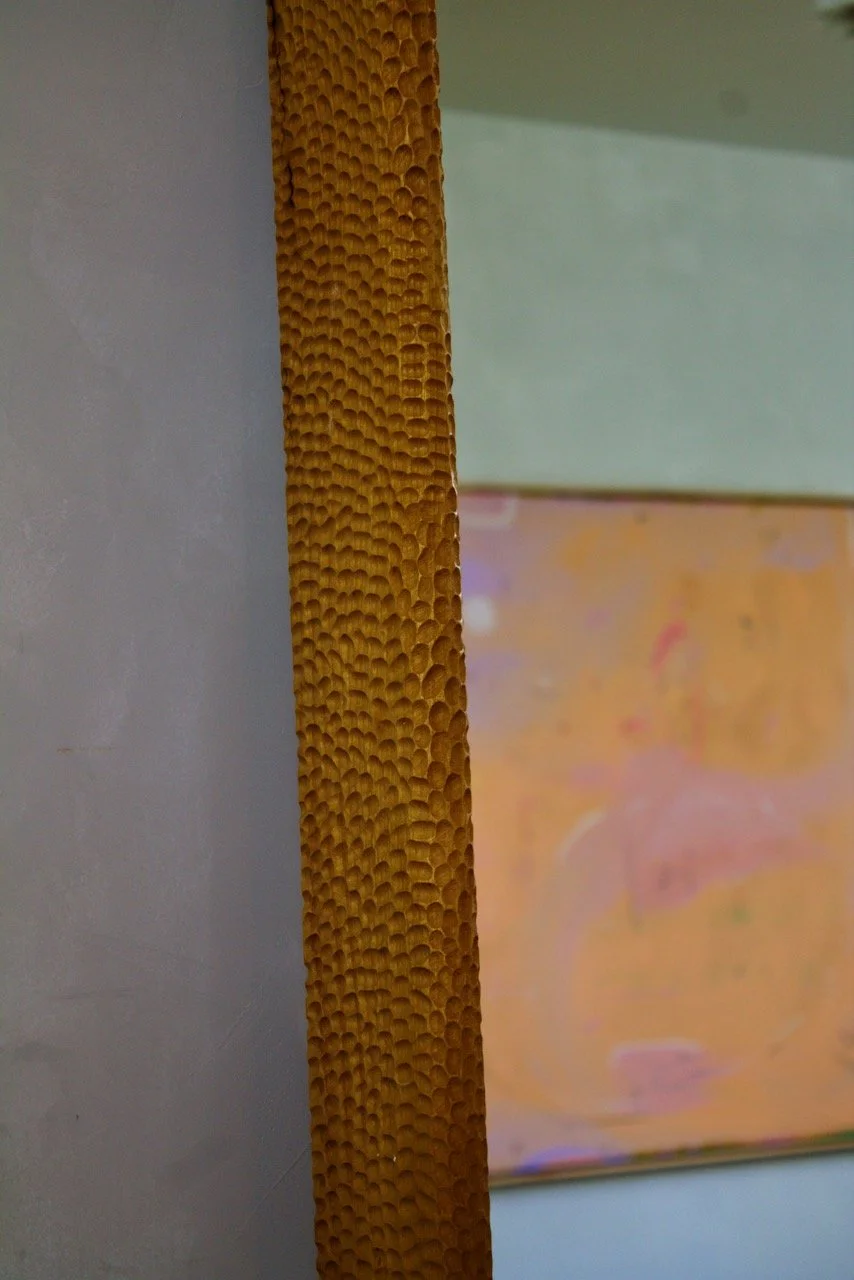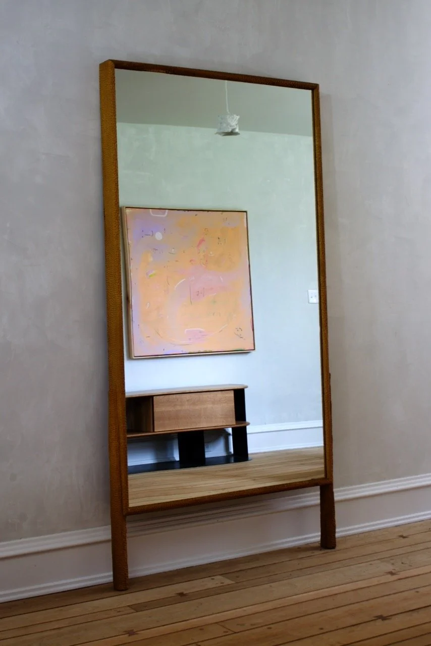 A generous bullnose framed mirror with hand Stipple detail throughout and soling leather feet.